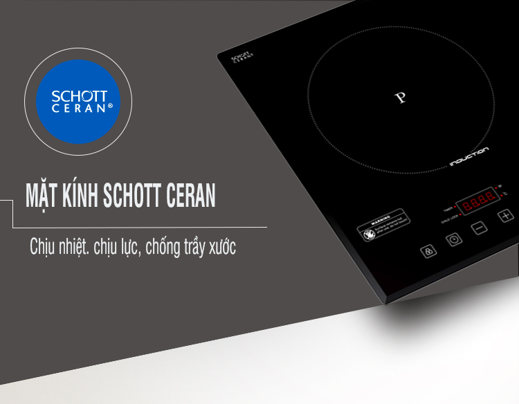 - Bếp được trang bị mặt kính Schott nguyên khối (Made in Germany), có thể chiụ được nhiệt độ lên đến 1000 độ C, chịu lực 180N, ngoài ra bề mặt phẳng nhẵn giúp quá trình vệ sinh lau chùi dễ dàng và tiện lợi hơn rất nhiều.