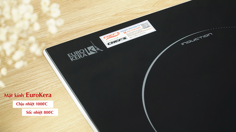 Mẫu bếp từ Chefs EH DIH206 được trang bị mặt kính EuroKera (Pháp) làm từ sợi gốm Ceramic thủy tinh siêu bền, có khả năng chịu nhiệt 1000°C, chống sốc nhiệt lên đến 800°C, chịu lực, chống va đập tốt. Thêm nữa bếp còn được bo viền nhôm 4 cạnh bên bảo vệ mặt kính trước những va chạm, tăng độ bền cho bếp.