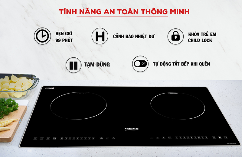 Bếp từ đôi lắp âm Chefs EH DIH206 còn được trang bị thêm tính năng hẹn giờ nấu lên đến 8 tiếng vô cùng tiện lợi, giúp cho bạn có thể chủ động hơn trong các công việc bếp núc của mình.