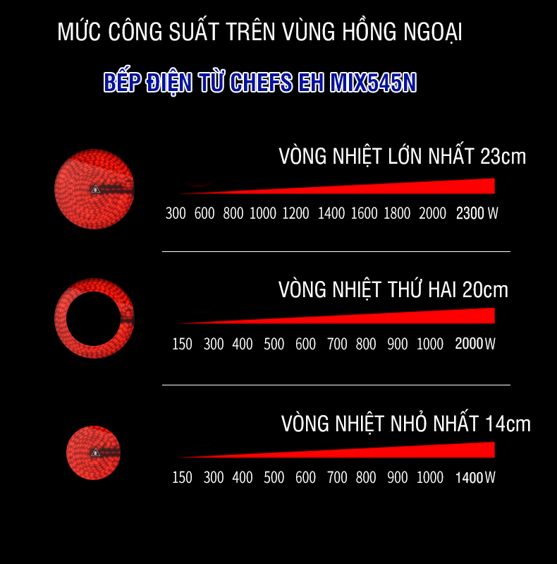 Khác hẳn với nhiều chiếc bếp hỗn hợp hiện có trên thị trường, thì model bếp điện từ Chefs EH MIX545N được trang bị mâm nhiệt EGO có thể tùy chỉnh 3 vòng nhiệt với mức công suất lơn nhất ứng với đường kinh vòng nhiệt lớn nhất 23cm là 2300W , vòng nhiệt nhỏ nhất 14cm có công suất lớn nhất 1400W, vòng nhiệt trung bình 20cm có công suất lớn nhất 2000w.