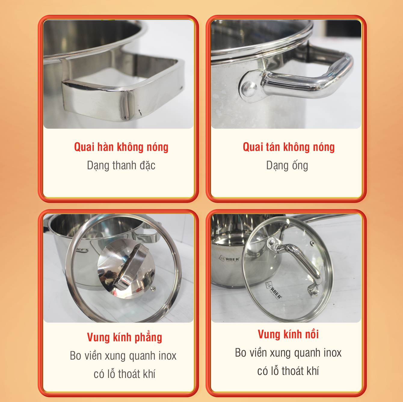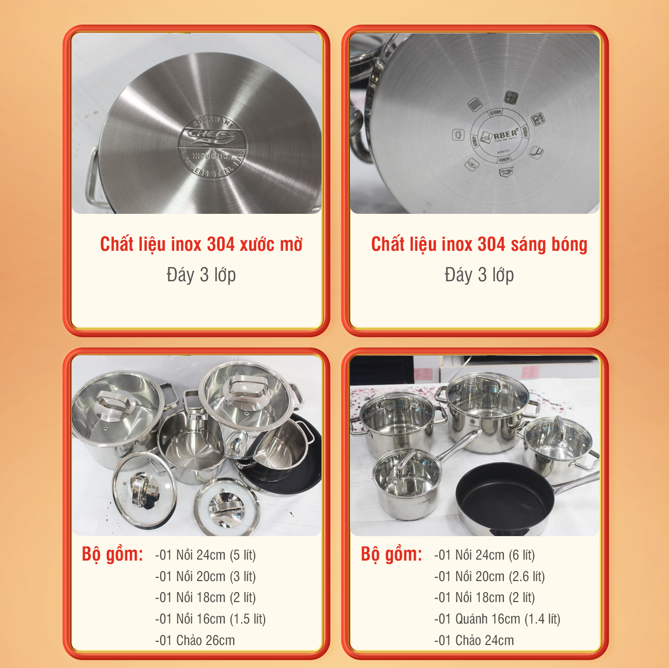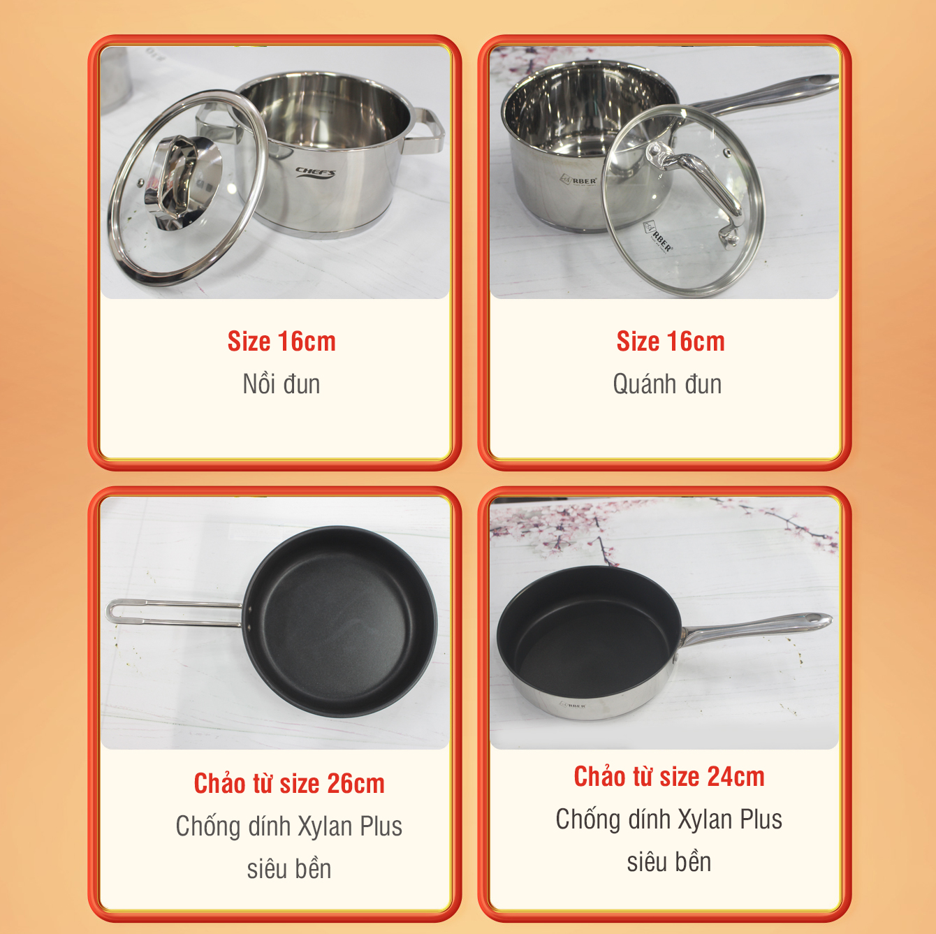 - Bộ nồi gồm: 01 nồi 24cm, 01 nồi 20cm, 01 nồi 18cm, 01 quánh 16cm, 01 chảo từ 24 cm.