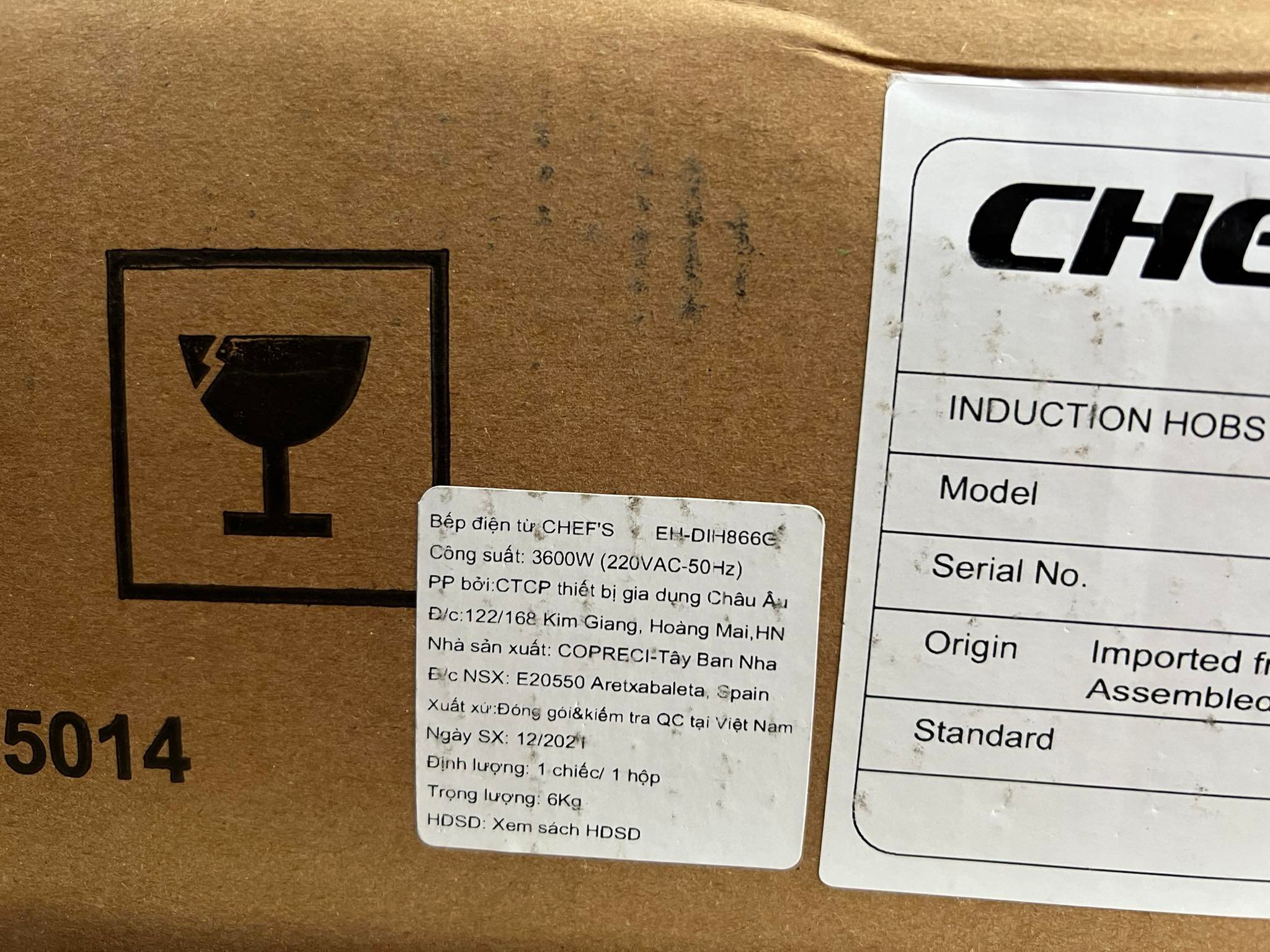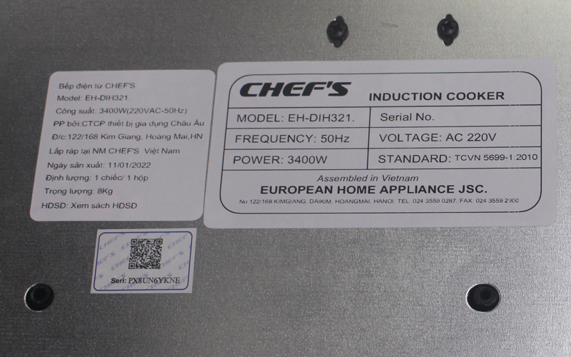 Vỏ hộp bếp từ Chefs có dán tem xuất xứ rõ ràng