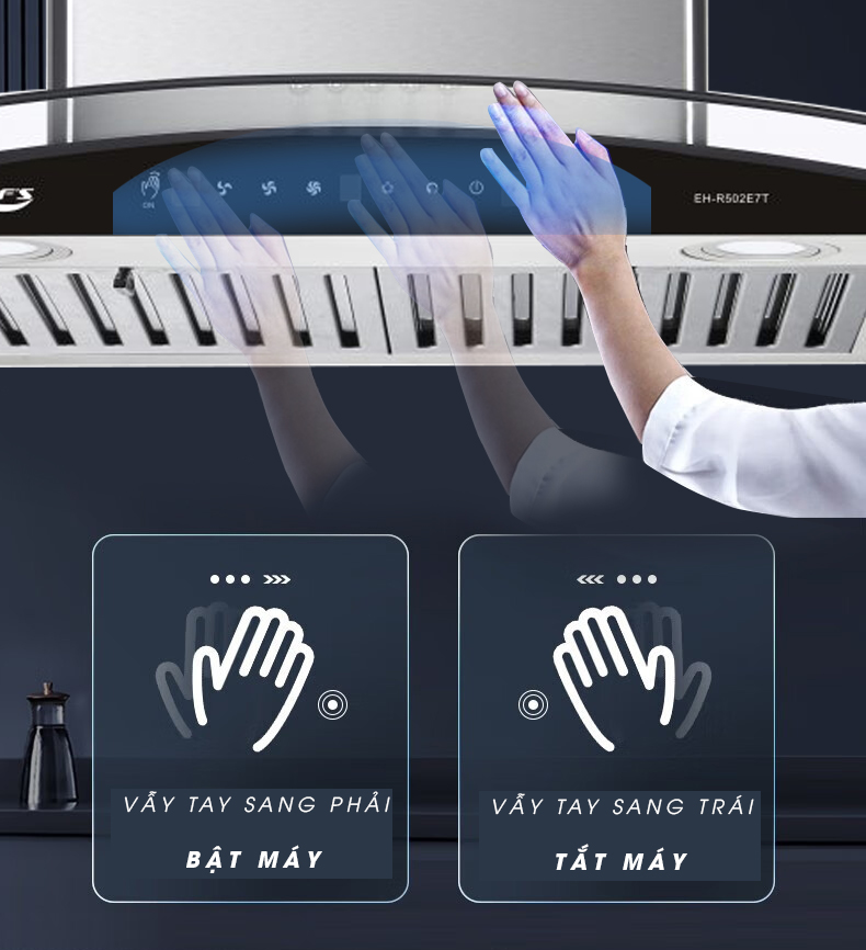 Thêm một điểm khiến cho máy hút mùi Chefs EH R502E7T trở nên khác biệt đó chính là bẳng điều khiển ứng của máy vừa có thế thao tác chạm cảm ứng để điều khiển như bình thường, lại vừa có thể thực thiện việc điều khiển bằng các thao tác cử chỉ mà không cần chạm và bảng điều khiển của máy. Điều này sẽ trở nên cực kì hữu dụng khi tay bạn đang dầu mỡ, dính bột, mà vẫn phải thao tác điều khiển với máy hút mùi, chỉ cần di chuyển bàn tay sang phải máy sẽ bật lên, di chuyển tay sang trái máy sẽ tắt.