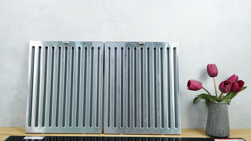 Máy được trang bị 2 tấm lưới lọc kiểu baffle inox siêu thoát, rất dễ tháo lắp với chốt khóa vặn xoay, điều này giúp công việc vệ sinh lưới lọc trở nên đơn giản và khắc phục tối đa hiện tượng bị móp méo của lưới lọc nhôm trên các mẫu hút kính cong khác thường hay sử dụng.