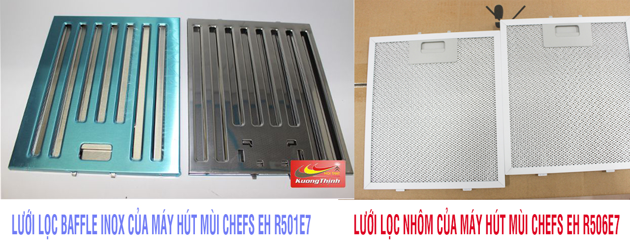 Đến từ 2 tấm lưới lọc hơi dầu mỡ của 2 chiếc máy này. EH R501E7 được trang bị tấm lọc baffle inox dạng vách ngăn, chống móp méo cực tốt dễ dàng vệ sinh tuy nhiên trọng lượng khá nặng nên việc tháo lắp người nội trợ phải rất thận trọng để tránh rơi và mặt bếp đun nấu. Còn đối với máy hút mùi Chefs EH R506E7 vẫn sử dụng 2 tấm lọc hợp kim nhôm 5 lớp, ưu điểm là tối ưu lọc hơi dầu mỡ, chi phí thay thế rẻ tiền, tuy nhiên lại rất dễ bị móp méo trong quá trình vệ sinh.