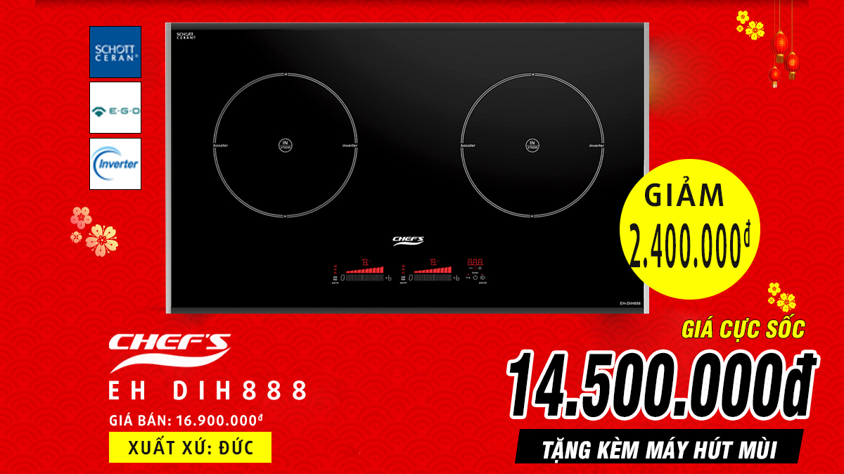 Trong dịp cuối năm và tết 2023, khi mua bếp từ Chefs EH DIH888 khách hàng sẽ được giảm ngay 2.4 triệu đồng, và giá chỉ còn 14.500.000 đồng. Ngoài ra bạn còn nhận được quà tặng là máy hút mùi kính cong Chefs EH R506E7G hoặc 1 bộ nồi Chefs 4 chiếc có chảo. Thêm nữa bạn còn nhận được những ưu đãi kèm theo như: