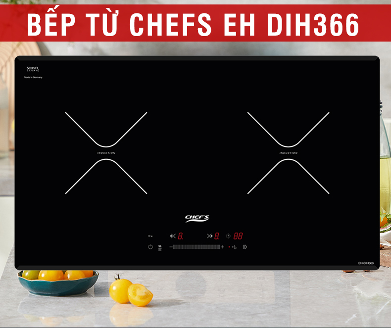 Bếp từ Chefs EH DIH366 sử dụng bảng điều khiển dùng chung cho 2 vùng nấu, tinh gọn, hiện đại, tiết kiệm không gian mặt bếp. Đi kèm với đó là công suất tối đa mỗi vùng nấu là 2400w ở chức năng booster, hẹn giờ, giữ ấm, tạm dừng...
