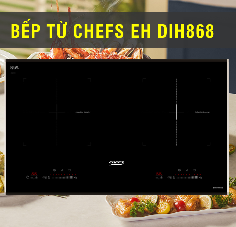 Bếp từ Chefs EH DIH868 được thiết kế với phong cách cực kỳ trẻ trung và hiện đại của châu âu, sang trọng hài hòa với mọi không gian, mặt kính schott được bo viền nhôm 2 cạnh bên sang trọng, giúp bảo vệ bếp tối đa trước những va chạm có thể làm nứt vỡ mặt kính. Hai vùng nấu của bếp được thể hiện bằng hình dấu + cách điệu tạo nét đẹp độc đáo cho bếp.Phím điều khiển mềm mại với đầy đủ các tính năng hiện đại.