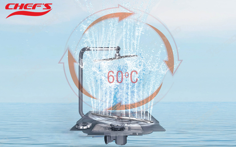 Ở các mẫu máy rửa bát Chefs đời mời hiện nay đều được trang bị công nghệ rửa bằng nước nóng với nhiệt độ của nước được làm nóng lên đến 60 độ C. Điều khi khi kết hợp với các tay phun nước áp lực cao sẽ tăng hiệu quả làm sạch bát đĩa, các vết dầu mỡ, mảng bám hay vết bẩn cứng đầu sẽ dễ dàng được làm sạch hơn.