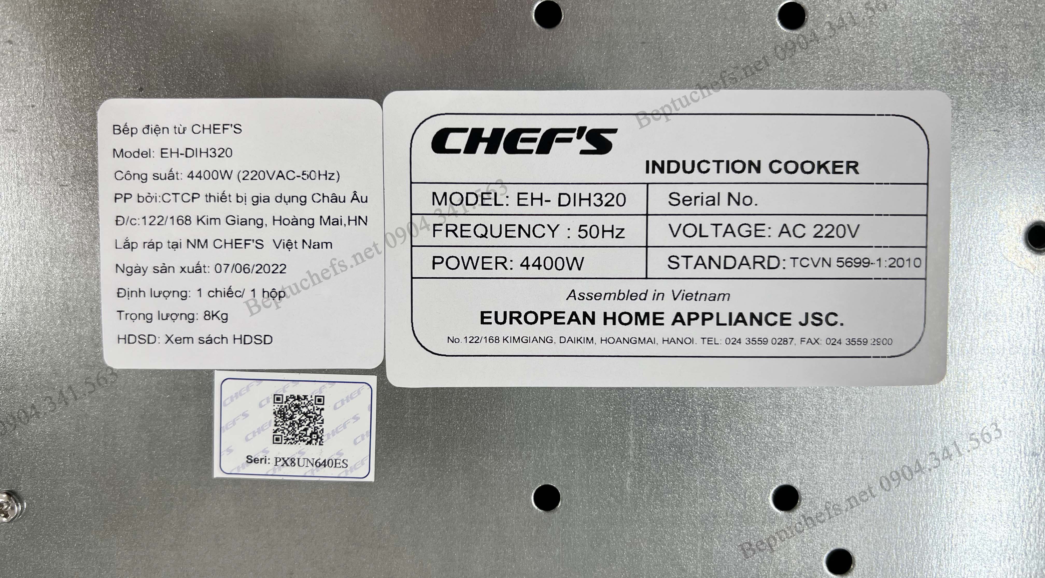 Tiếp đến, một mẫu bếp "Quốc dân" không kém - bếp từ Chefs EH DIH666 được lắp ráp tại Việt Nam, khác với dòng nhập khẩu thì mẫu lắp ráp được in rõ ngày, tháng, năm sản xuất trên tem đáy bếp.