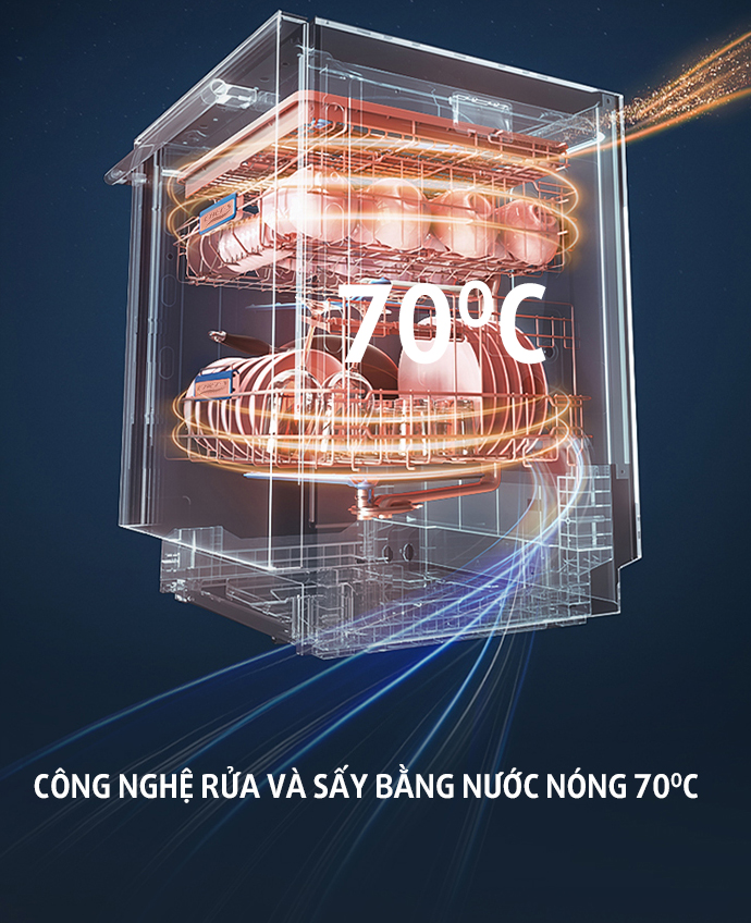 Công nghệ rửa nước nóng được cải tiến vượt bậc, sử dụng nước nóng 75 độ C để đánh bay những vết bẩn cứng đầu như vết kho cháy bám đáy nồi, vết trứng sống bám trên bát đĩa....
