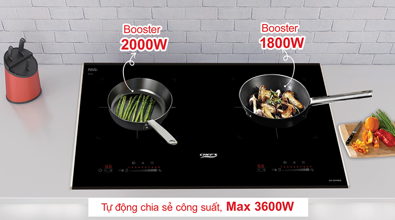 Tính năng tự động công suất giữa 2 bếp, mức công suất tối đa khi sử dụng đồng thời 2 vùng nấu là 3600W. Khi bếp đã đạt mức công suất này, nếu 1 vùng nấu tăng mức công suất lên, bên còn lại sẽ tự động giảm xuống, đảm bảo công suất sử dụng không vượt quá 3600W, bảo vệ an toàn nguồn điện và tăng tuổi thọ cho bếp.