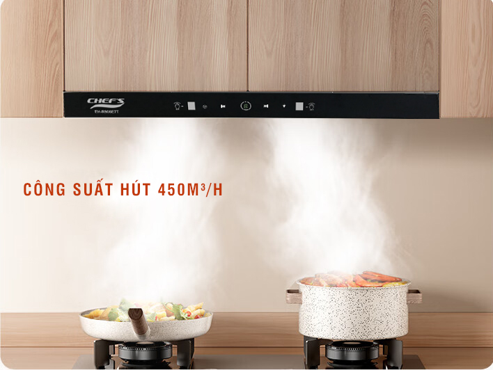Máy hút mùi Chefs EH R906E7T sở hữu công suất tối đa đến 450m3/h giúp hút khói bụi nhanh chóng, khử mùi dầu mỡ hiệu quả. Thêm vào đó, thiết bị sở hữu động cơ EcoSilence giúp máy vận hành êm ái với độ ồn dưới 53 dB (tương đương với một cuộc trò chuyện bình thường) và không gây khó chịu quá nhiều đến hoạt động của gia đình.