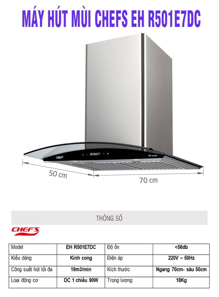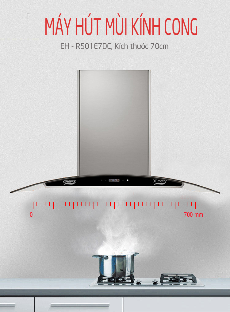 Máy hút mùi Chefs EH R501E7DC được thiết kế với kiểu dáng của dòng máy hút mùi kính cong treo áp tường, kích thước ngang 70cm phù hợp cho mọi không gian nhà bếp hiện tại ở Việt Nam. Kiểu dáng kính cong không những giúp quá trình hút mùi hiệu quả hơn mà còn tăng vẻ đẹp thẩm mỹ cho gian bếp sở hữu chiếc máy này.