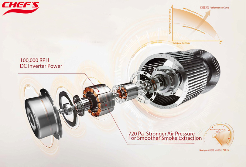 Với việc áp dụng công nghệ mới thì động cơ sử dụng trên máy hút mùi có tốc độ quay lên đến 100.000 vòng /h, giúp tăng cường khả năng hút mùi. Thêm nữa hệ thống biến tần mới sẽ tăng cường khả năng hoạt của máy hút mùi Chefs EH R506E7S khi mà động cơ tạo ra áp suất lên đến 720Pa.