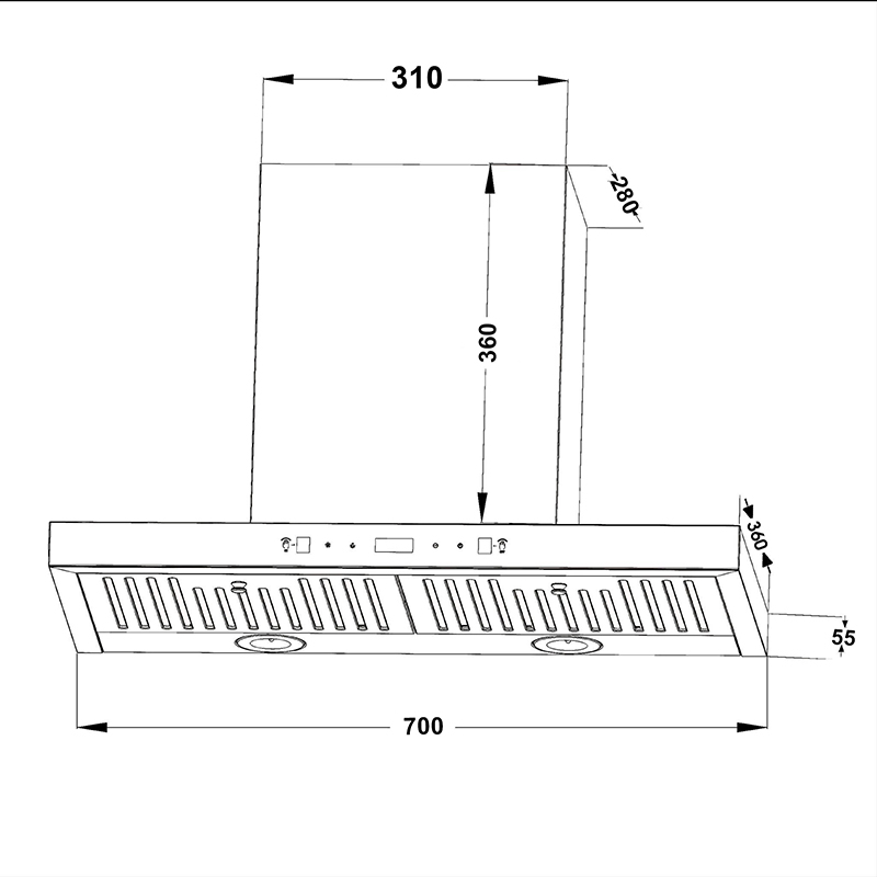 - Hút mùi chữ T, kính cường lực màu đen sang trọng, kích thước 70cm