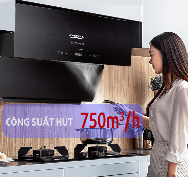 Chiếc máy hút mùi Chefs EH R706E7D có công suất hút lên đến 750m3/h giúp hút khói bụi nhanh chóng, khử mùi dầu mỡ hiệu quả. Thêm vào đó, thiết bị sở hữu động cơ BLDC, tiết kiệm điện với tuổi thọ cao, giúp máy vận hành êm ái với độ ồn 42 dB (tương đương với một cuộc trò chuyện bình thường) và không gây khó chịu quá nhiều đến hoạt động của gia đình.