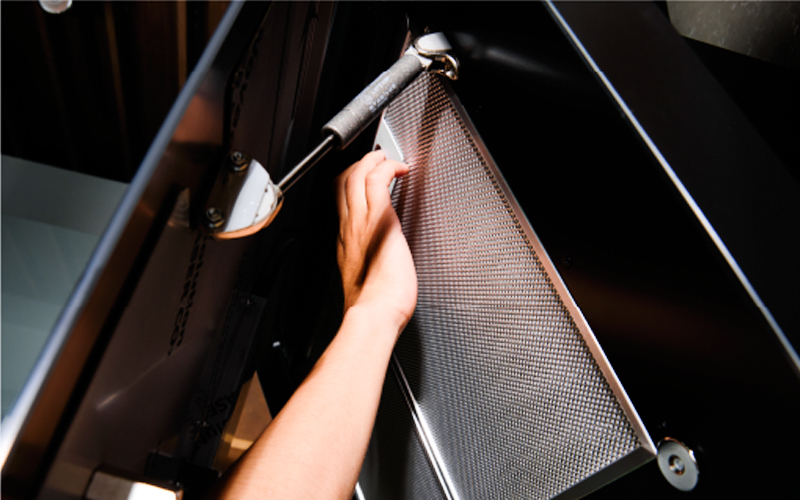 Máy có lưới lọc bằng hợp kim nhôm có trọng lượng nhẹ, dễ dàng thoát khí, thoát mùi, cho phép người dùng có thể tháo rời để dễ dàng vệ sinh định kỳ sau khi dùng.