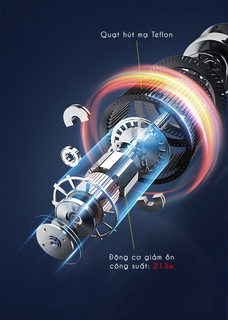 Đê cung cấp một công suất hút cực kỳ lớn cho máy, thì hãng đã cho bị cho sản phẩm của mình động cơ giản ồn thế thế hệ mới với công suất động cơ 213W và nhiều cải tiến về mặt công nghệ, như quạt hút được mạ teflon chống bám dính dầu mỡ và cánh quạt, hạn chế tối đa việc duy trì bảo dưỡng khi sử dụng lâu dài và giảm ồn tối đa khi làm việc.