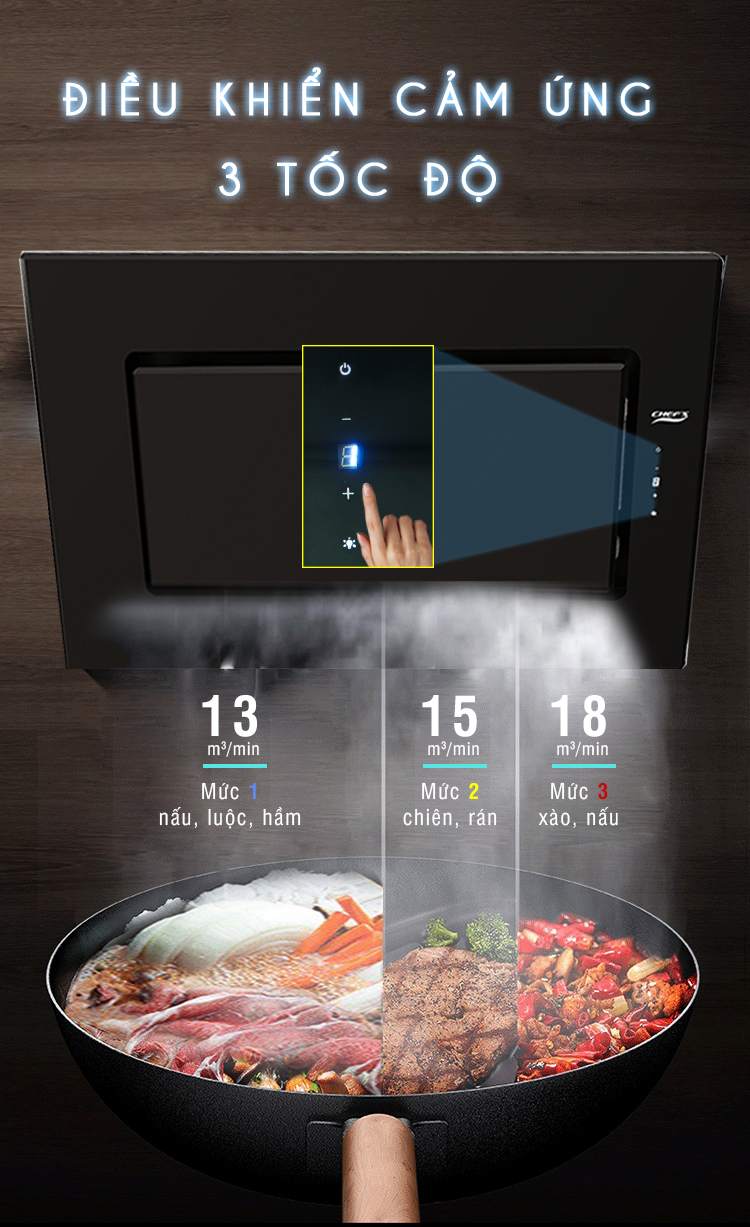 Bạn có thể tùy chỉnh 3 cấp độ hút mùi bạn mong muốn khi sử dụng, và được điều chỉnh bằng các phím cảm ứng trên bảng điều khiển của máy. Các cấp tốc độ ứng với các số thứ tự từ 1, 2,3 được hiển thị khi tùy chỉnh. Ngoài ra bạn còn bật hoặc tắt đèn led chiếu sáng khu vực nấu ăn để hỗ trợ thêm ánh sáng.