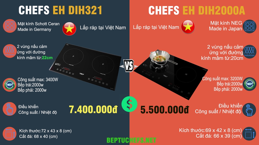 Tết đã đến rất gần nhu cầu mua bếp từ của các gia đình tăng lên cao, đặc biệt nhu cầu lựa chọn một chiếc bếp từ chất lượng sử dụng ổn định, giá cả phải chăng. Với mức giá dưới 10 triệu thì 2 mẫu bếp từ chefs eh dih2000a và dih321 đang là những lựa chọn tuyệt vời nhất hiện nay, nhưng nó cũng là băn khoăn của nhiều khách hàng. Hôm nay tư vấn viên Vân Anh của Showroom ủy quyền chính hãng Chefs cùng bạn so sánh 2 mẫu bếp chefs này để có thể chọn được một bếp ưng ý và phù hợp với gia đình mình nhất nhé.