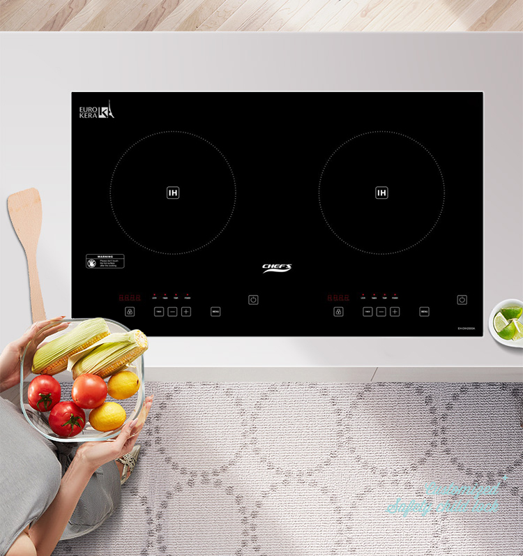 Sự đơn giản là một câu chính xác nhất để nói về thiết kế của Chefs EH DIH2000A, giao diện 2 vùng nấu được nhận biết bằng 2 vòng tròn sơn điện ly màu trắng và chính giữa là chữ "IH" rất dễ nhận biết.