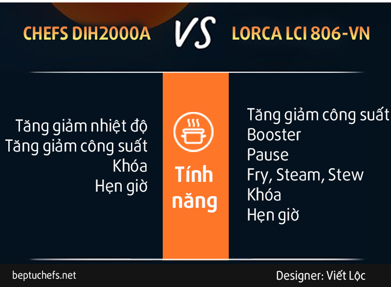 Bạn sẽ bất ngờ đấy khi mà cùng ở mức giá hơn 5 triệu đồng tuy nhiên tính năng của mẫu bếp từ Lorca LCI 806VN được hỗ trợ và tích hợp nhiều hơn, như booster, pause, Fry, steam, stew. Còn ở mẫu bếp Chefs EH DIH2000A , bạn chỉ có thể tăng giảm công suất hoặc nhiệt độ đơn giản khi đun nấu bên cạnh các tính năng cơ bản được hỗ trợ như hẹn giờ, khóa an toàn...