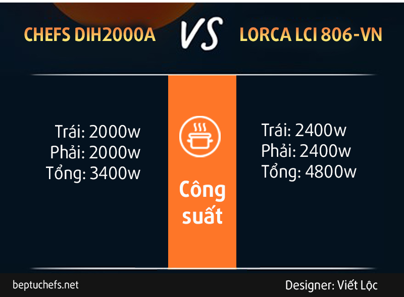 Bếp từ Chefs EH DIIH2000A sở hữu 2 vùng nấu có công suất 2000w mỗi vùng và tổng công suất 3400w (do có tự động chia sẻ công suất giữa các vùng nấu). Còn ở mẫu bếp từ Lorca LCI 806VN cũng sở hữu 2 vùng nấu có công suất 2400w và tổng là 4800w, và đặc biệt ở mẫu bếp Lorca còn được tích hợp công nghệ inverter.