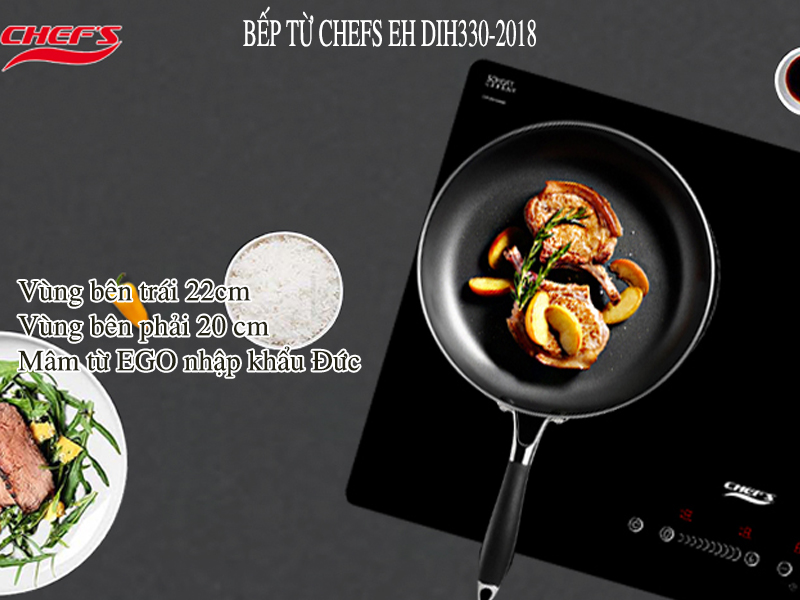 Model bếp từ Chefs EH DIH330 là bản nâng cấp của DIH333 nhập linh kiện EGO, và SCHOTT của Đức và được lắp ráp hoàn thiện tại nhà máy của hãng Chefs tại Việt Nam, với thiết kế mới và hiện đại giúp chiếc bếp đẹp và bắt mắt hơn. Bếp từ Chefs EH DIH330 được trang bị 2 mâm từ EGO có đường kính 22cm(3000w) và 20cm(1400w), để bếp có thể tạo ra công suất 3600w khi đun đồng thời cả 2 vùng nấu, kết hợp với bàn phím cảm ứng slide hỗn hợp siêu mượt mà và nhạy cảm.
