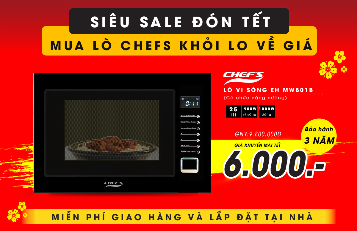 Hiện tại mẫu lò vi sóng Chefs EH MW801B đang nằm trong chương trình khuyến mãi cực lớn dịp tết dành cho khách hàng tại showroom ủy quyền chính hãng beptuchefs.net, những ưu đãi cụ thể như: