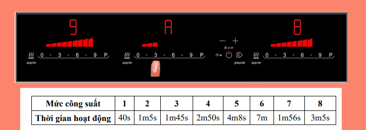 Để sử dụng chức năng này bạn chỉ cần ấn vào phím P trên bàn phím và màn hình led sẽ xuất hiện chữ P, và thời gian sử dụng mặc định cho chức năng booster này là 5 phút sau đó bếp sẽ tự động chuyển về mức công suất số 9 của mỗi vùng.