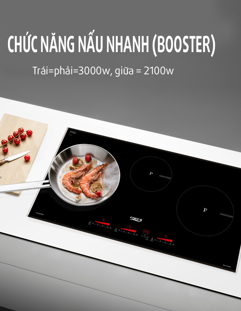 Sở hữu tới 3 vùng nấu có kích thước khác nhau, nhưng tất cả chúng đều được tích hợp tính năng nấu nhanh booster với thông số cụ thể như sau: bếp trái 22cm/ booster 3000W, bếp phải 22cm/ booster 3000W, bếp giữa 18cm/ booster 2100W.