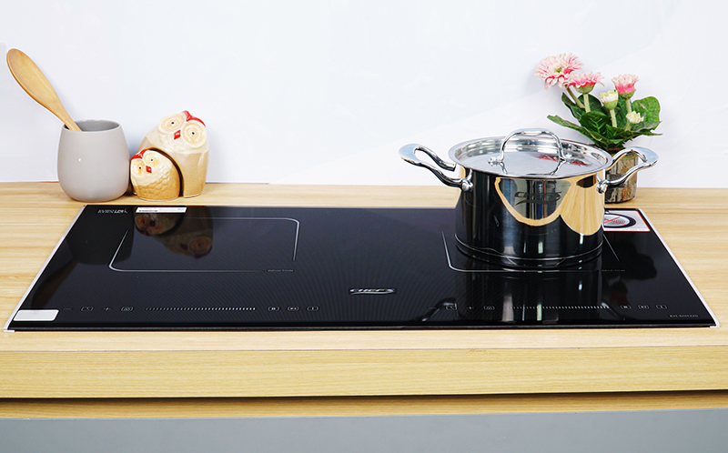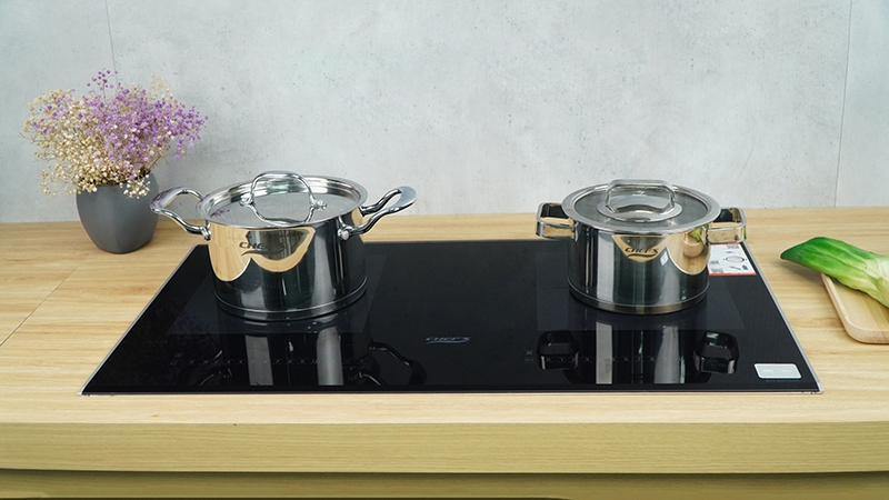 Bếp được trang bị mặt kính Schott vát cạnh, có bo viền nhôm chống va đập, 2 vùng nấu trên bếp được thể hiện bằng 2 hình màu vuông phủ chấm bi xám nổi bật, hạn chế các vết trầy xước. Bảng điều khiển của bếp cũng được thiết kế tách riêng, khiến ngưới sử dụng cảm nhận được sự thân thiện dễ sử dụng.